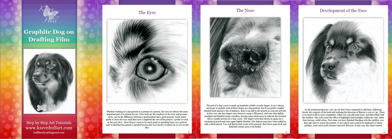 This 17 page tutorial gives you step by step images with instructions on how to do a dog portrait using graphite and black pencils on drafting film. Working on drafting film is unlike any other surface and you will find many handy hints to assist you throughout this tutorial. You can learn more about drafting film on the Information Page.