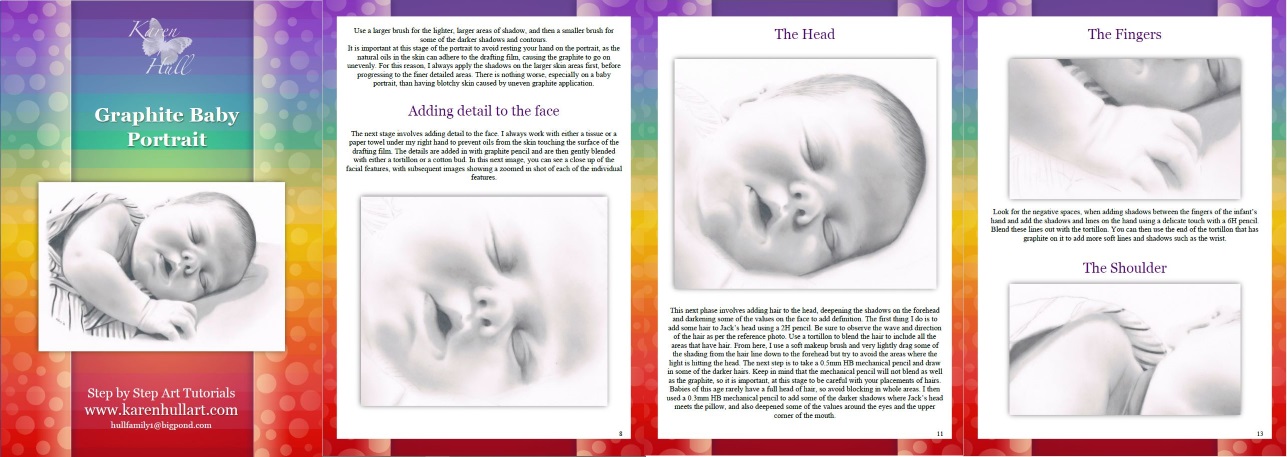 This tutorial features 10 pages of guided steps on how to draw a realistic portrait of an infant using graphite pencil on drafting film. The principles used in this tutorial can be applied to any graphite portrait of a person or child. Includes a guide to all materials used and handy hints about working with drafting film. You can read more about drafting film on the Information Page.