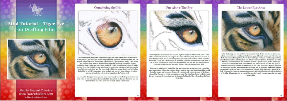 This 20 page mini step by step tutorial shows you how to draw this Tiger Eye using coloured pencils on drafting film. If you prefer not to use drafting film, you can apply the same colours and techniques to any smooth surfaced paper, the only difference being that you will need to preserve hairs and whiskers, rather than scratching them out as you do on film. This tutorial is ideal for anyone new to drafting film who would like an easy project with limited pencils to start them off.