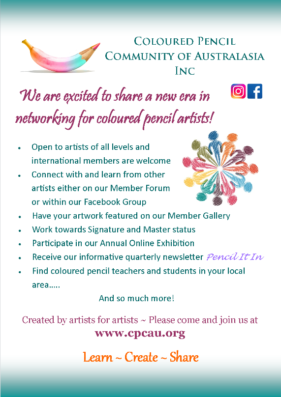 We would love for you to come and join us at this exciting new Association created by coloured pencil artists for coloured pencil artists with a goal to connect, educate and promote both our members and the Coloured Penci medium within the Australasian region and beyond. We welcome artists of all levels and from all parts of the globe. For more information please visit the website at https://www.cpcau.org/
