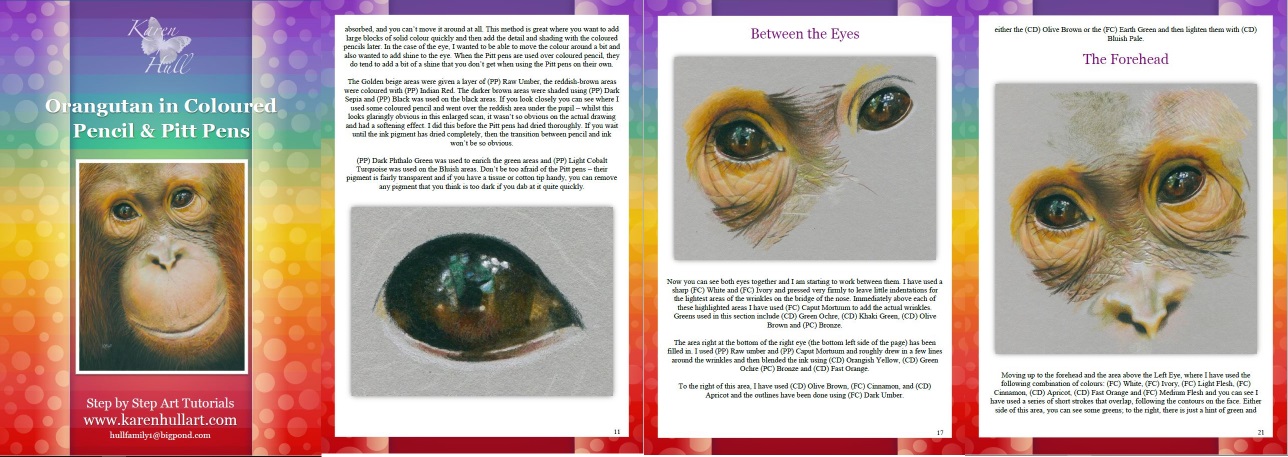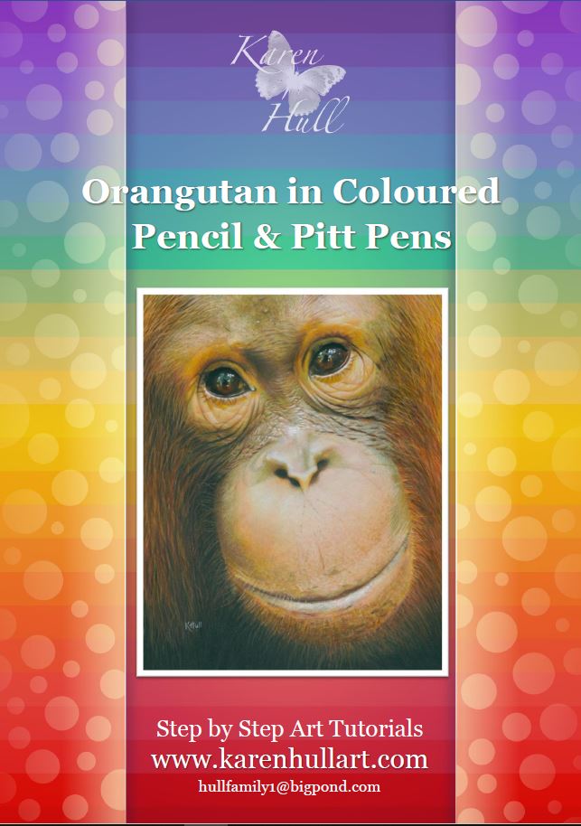 This 28 page tutorial shows you how to draw this darling Orangutan Bunga using Coloured Pencils and Faber Castell Pitt Pens. It includes multiple full colour images and detailed instructions. To assist you in completing this tutorial, I have also completed a Speed Drawing of the process which you can view on YouTube.