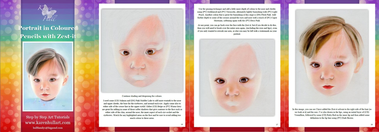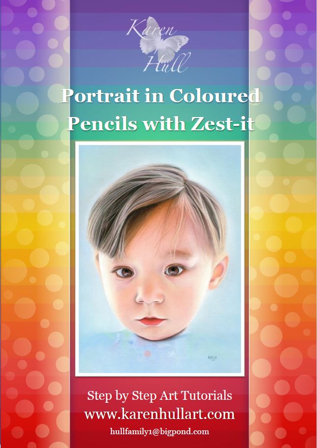 This tutorial features 26 pages of guided instructions on how to do a coloured pencil portrait using Zest-it Pencil Blend Solvent on Pastelmat to get lovely smooth skin tones, and a very realistic look. It also includes information on how to combine Pan Pastels with your coloured pencils for a softly blended background.